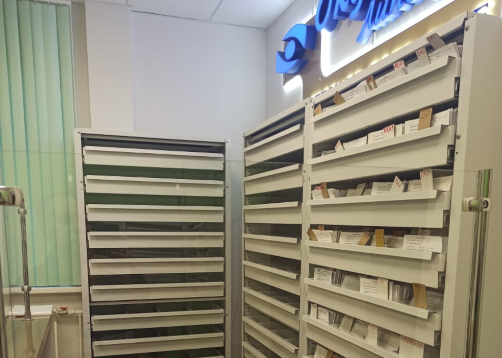 Ячейки хранения в стеллажах производятся с учетом формата документов или амбулаторных карт.