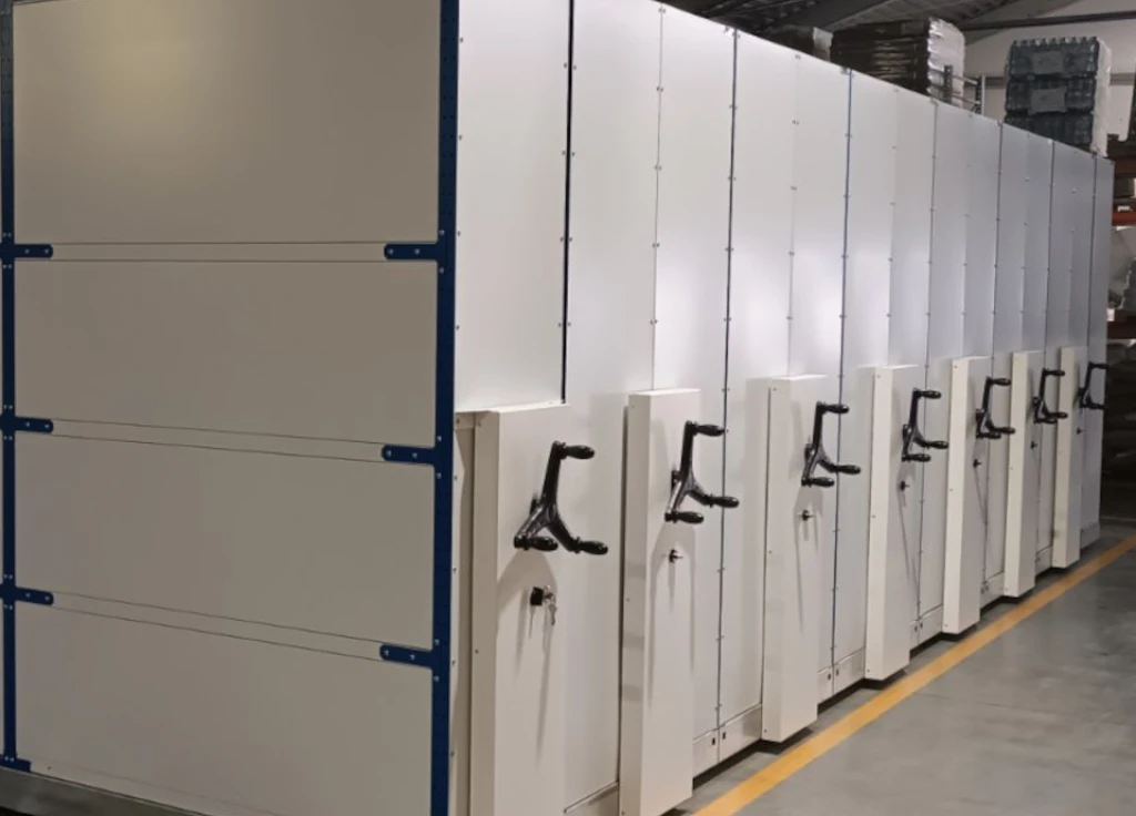 Среднегрузовые мобильные стеллажи с закрывающимися секциями для цеха или производства.