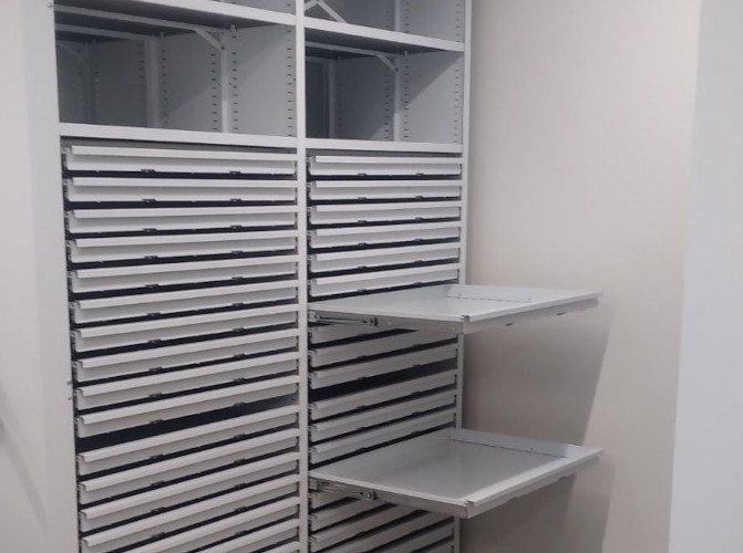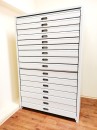 Металлическая конструкция с выдвижными плоскими ящиками небольшой высоты, предназначенными для компактного хранения крупноформатной документации. Обеспечивает удобный доступ, экономию пространства и сохранность чертежей, схем и карт.